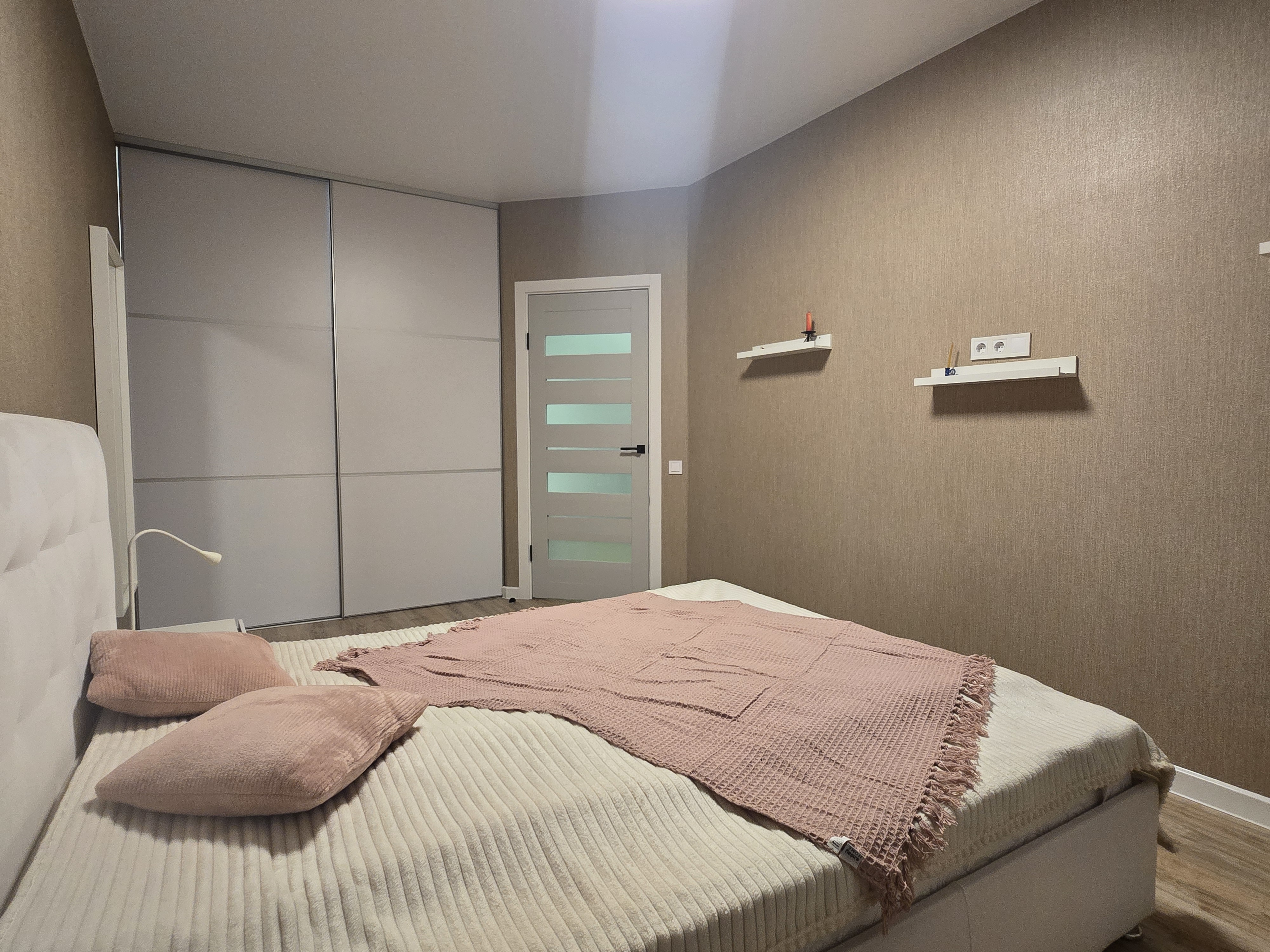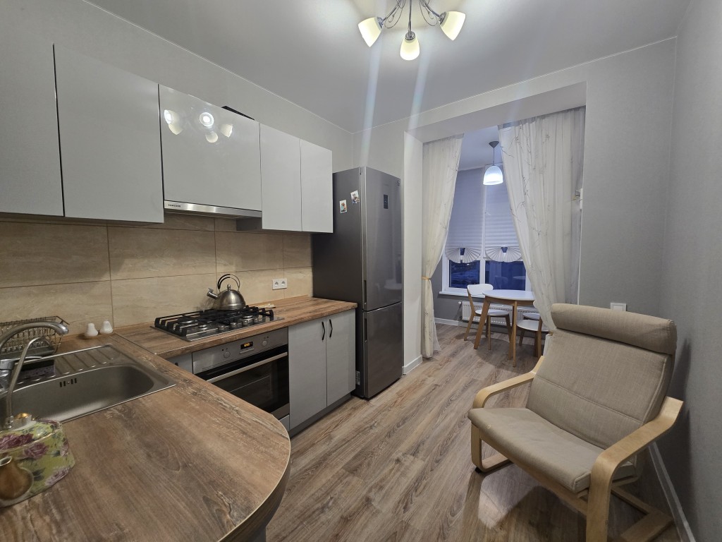 Простір грамотний на 3 повноцінні зони: Кухня з нормальною робочою зоною; Зона столової - лоджії; Повноцінна спальна кімната з двоспальним ліжком; Гардеробна кімната ну дуже простора;
