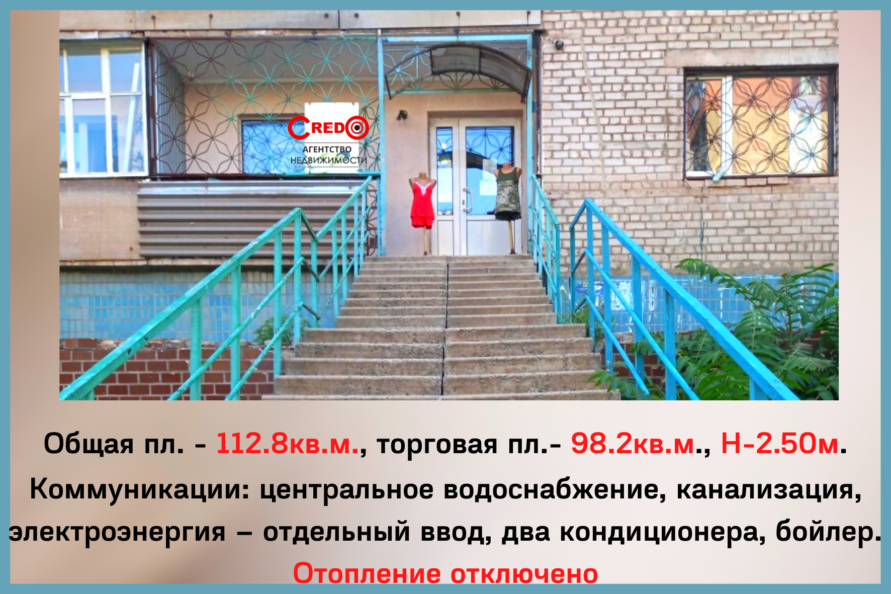 О. пл. – 112.8кв.м., торговая пл.- 98.2кв.м., Н-2.50м.